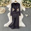 Jesień Wiosna Kobiety Elegancki Sweter Dzianinowy z Dekoltem w Serek Jednorzędowy Długie Sukienki Midi z Rozcięciem