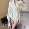 Damski sweter jesienno-zimowy, luźny, modny, dojazdy do pracy, długi, dzianinowy kardigan z dekoltem w serek, gruby, długi płaszcz z rękawami