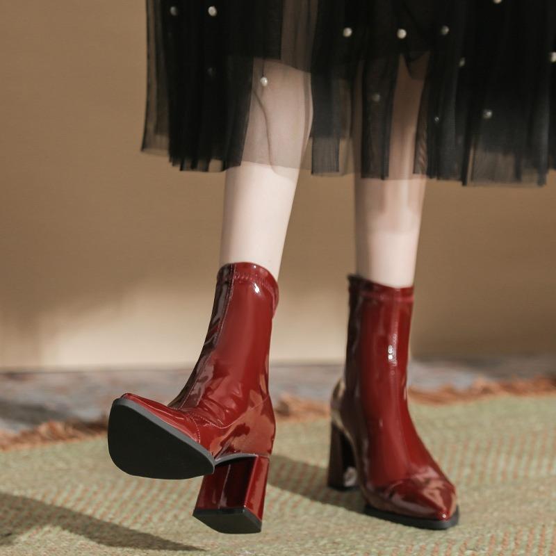 H768-8 Autumn and winter patent leather short boots women's rear zipper thin design Martin boots thick heel pointed low boots are not tired