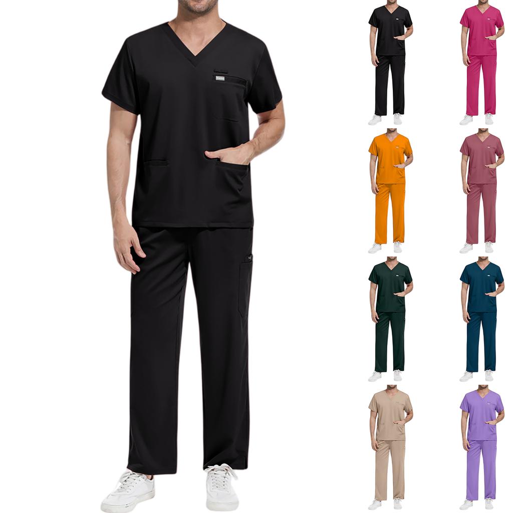 Męski Luźny i Wygodny Strój Roboczy z Dekoltem V i Krótkim Rękawem, z Bluzką Wiązaną i Wyszczuplającym Talię Zestaw Piękności