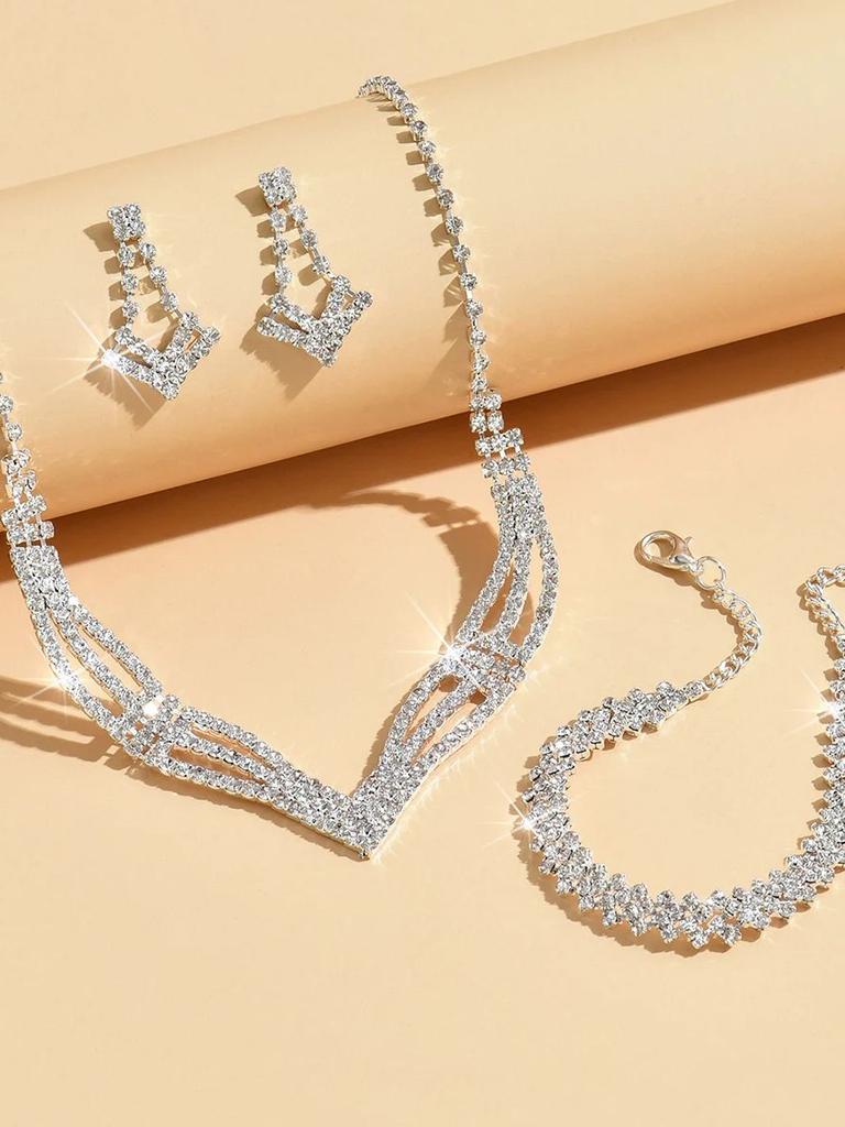 4PC Women's Fashion Geometric Necklace Earrings Bracelet Zircon Set Simple Light Luxury Style High End Zircon Set