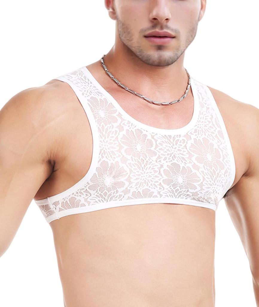 Seksowne Koronkowe Podkoszulki Tank Top z Kwiatową Przezroczystością i Oddychającym Rozciągliwym Materiałem Rozmiar XL Męskie Nadruki, Kamizelka, Koszula, Bez Rękawów, Modelujące Mięśnie, Białe,