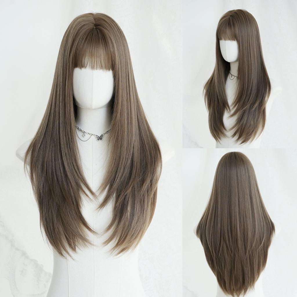 【Codzienny Szybki Wybór Piękna】Herbaciany brązowy perukę prostą do wewnątrz, warstwowe cięcie z pełną grzywką, doskonale modyfikuje kształt twarzy! 210g lekki, wygodny w noszeniu, szybko tworzy naturalną codzienną stylizację, natychmiast poprawia temperament i wygląd.