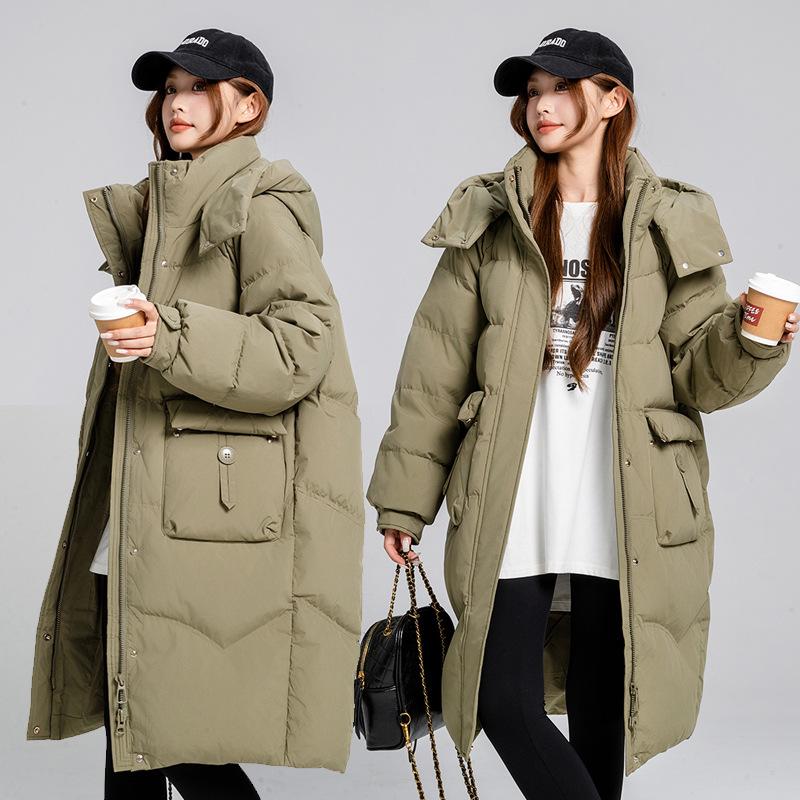2025 winter new mid-length down padded jacket large size loose Korean over-the-knee padded jacket women's detachable hat