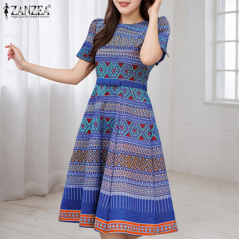ZANZEA Damska codzienna sukienka z okrągłym dekoltem, letnia, z krótkim rękawem i nadrukiem