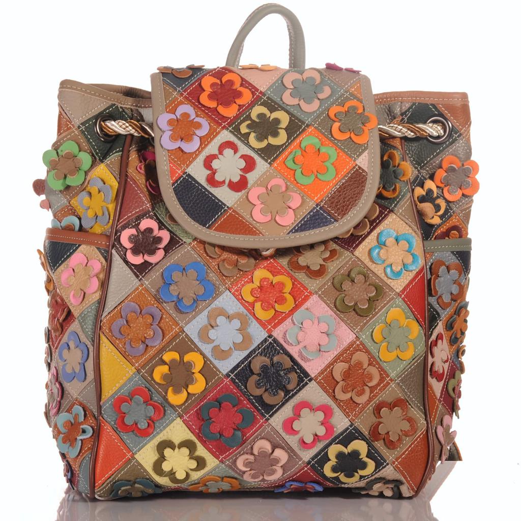 Damski skórzany plecak – Patchworkowy kwiatowy design ze sznurkiem