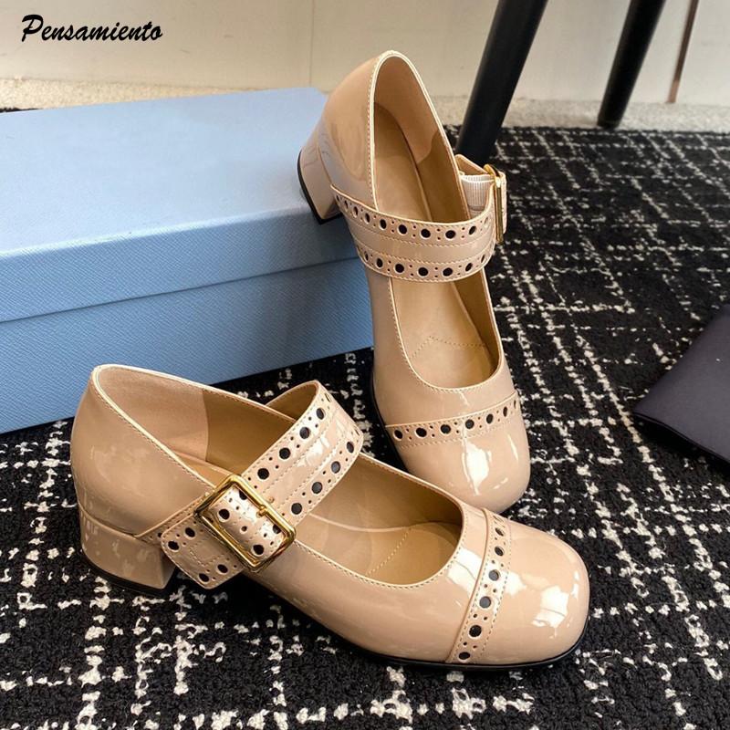 Fashion Fashion Patent Leather Hollow out Mary Janes Women Pumps Spring Summer Vintage Belt Buckle Chunky heels Girl Shoes Zapatos Mujer