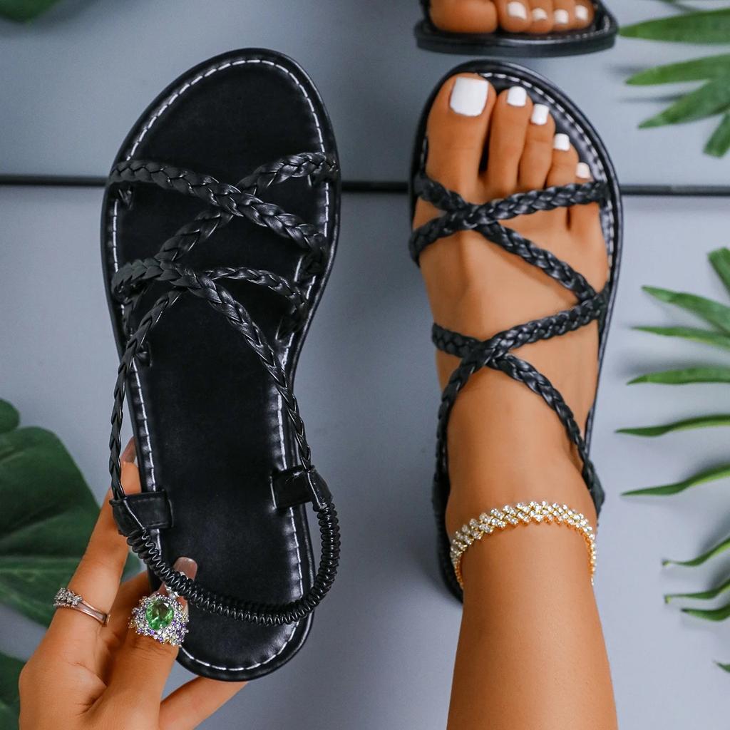 Fashion Women Sandals Fashionable Plus Size Shoes Thong Casual Flat Sandals Women New Style Braided Foot Elastic Band Roman Beach Shoes