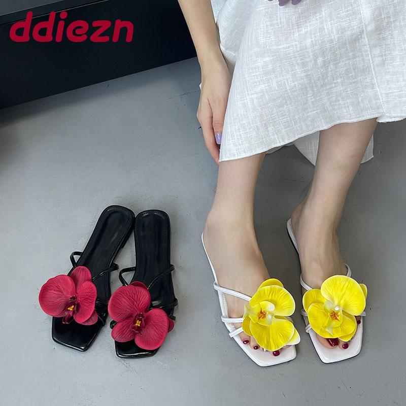 Fashion Big Size 43 Summer Beach Women Flats Slippers Shoes Square Toe Fashion Flower Ladies Flats Slippers Female Slides Sandals Shoes