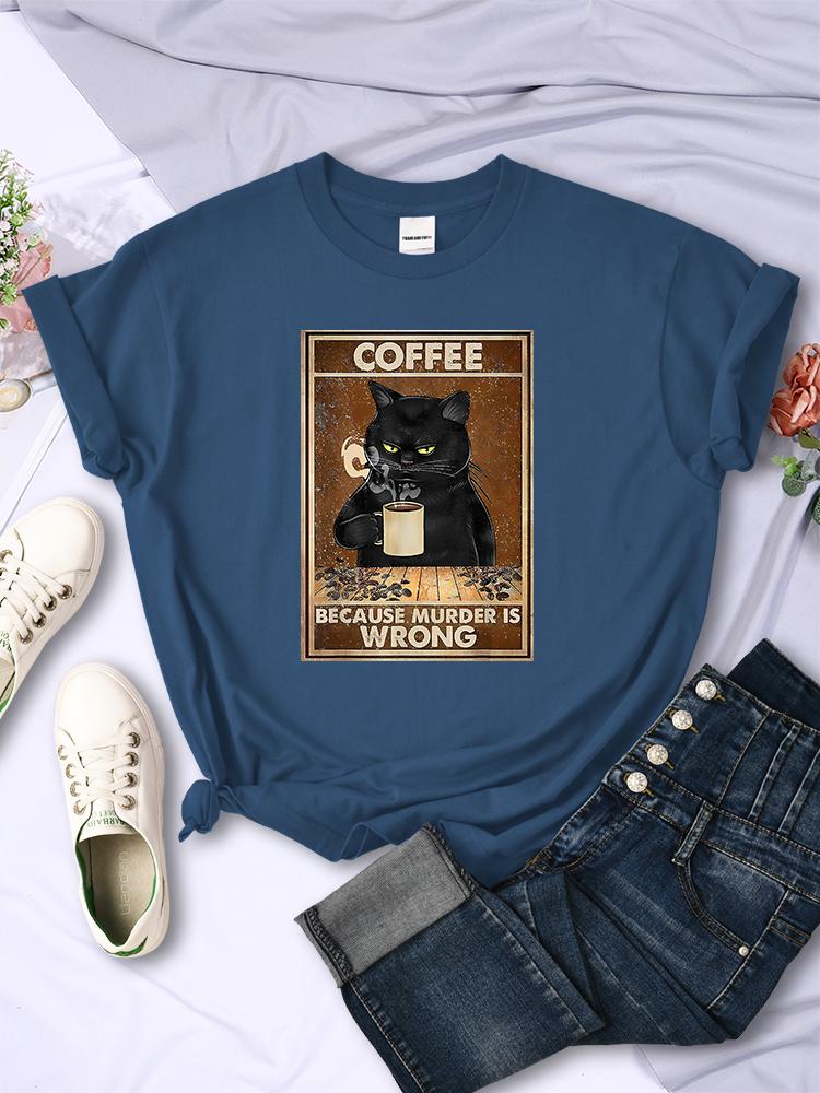 Ponieważ Morderstwo Jest Złe Czarny Kot Pije Kawę Damski T-shirt Odzież Okrągły Dekolt Vintage Krótki Rękaw Osobowość Casual Damskie Koszulki
