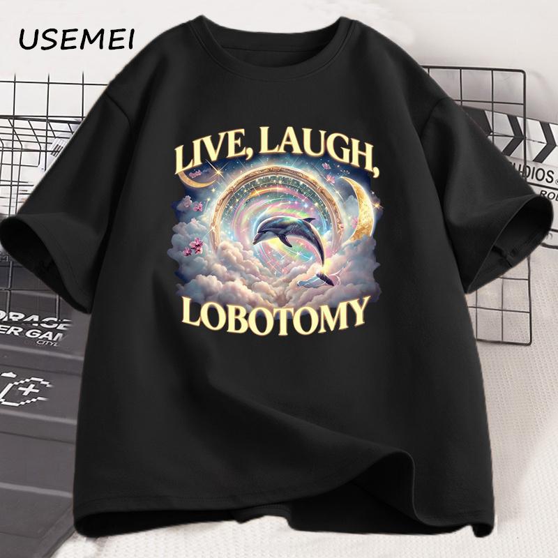 Live Laugh Lobotomy Koszulka Męska Damska Śmieszna Delfin Meme Koszulka Głupia Bawełniana Krótki Rękaw Dziwne Vintage Koszulki Graficzne