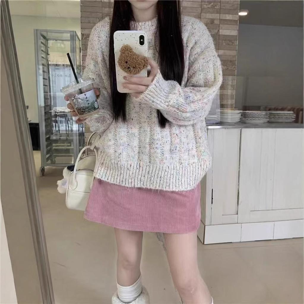 Autumn and winter new lazy wind round neck color thread mixed color knitted sweater loose soft waxy thin pullover sweater women