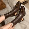 Modne botki na francuskim obcasie w stylu vintage z kwadratowym noskiem i kamelią, dopasowane botki damskie