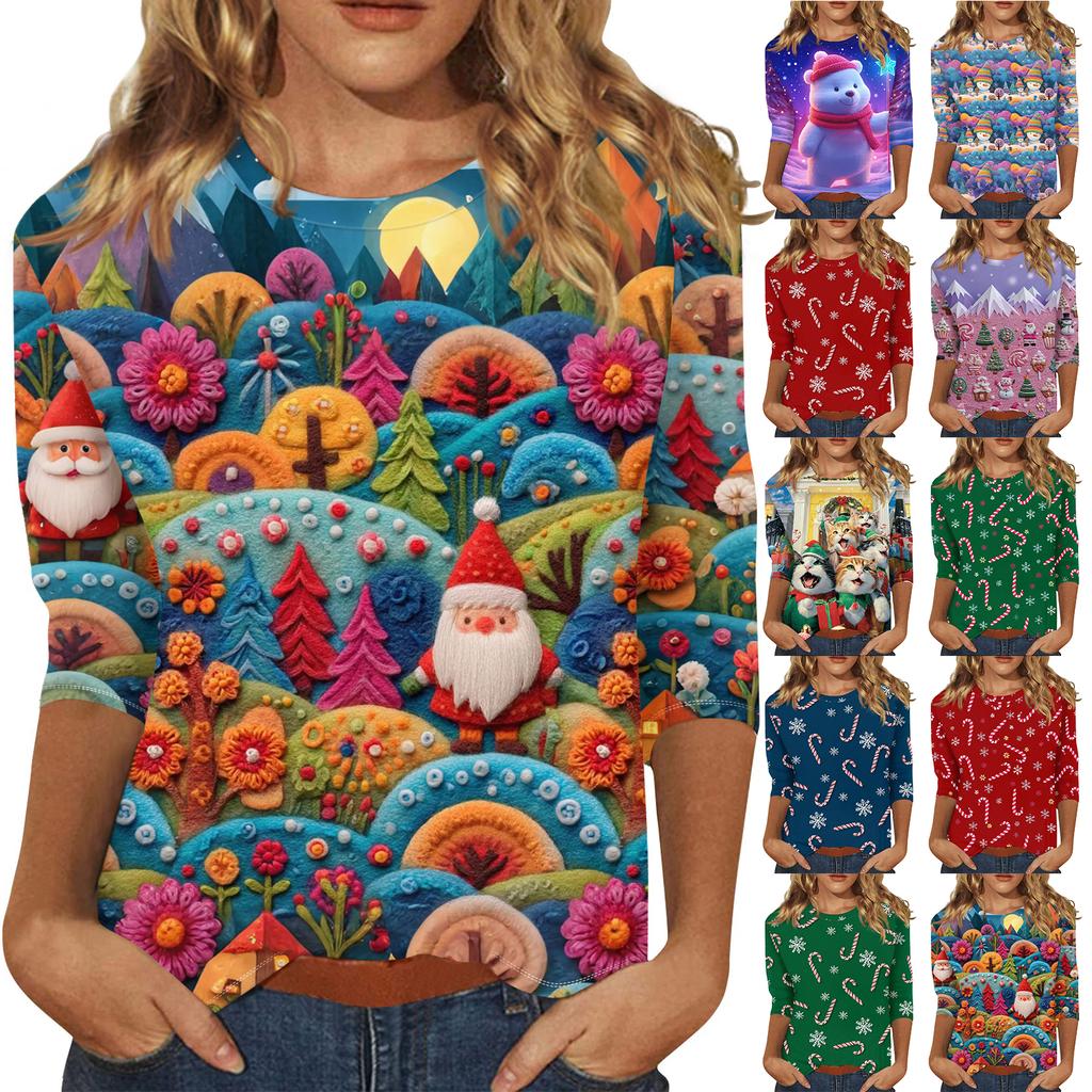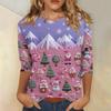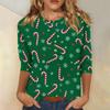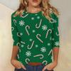 Damska modna i codzienna bluzka z rękawem trzy czwarte, z okrągłym dekoltem i nadrukiem świątecznym