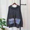 Hooded splicing denim pocket knitted cardigan autumn and winter new medium and long loose sweater jacket women