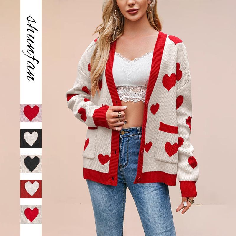 New women's clothing Valentine's Day love peach knitted cardigan pocket V-neck regular jacket