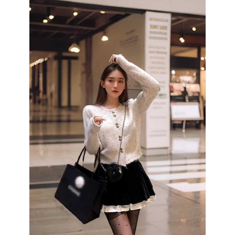 Starry Dot French Style Design Classic Style round Neck Flower Knitting Cardigan + A- line Velvet High Waist Skirt