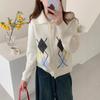 Retro literary and artistic contrasting color diamond lapel knitted cardigan top women's loose lazy wind age-reducing sweater jacket