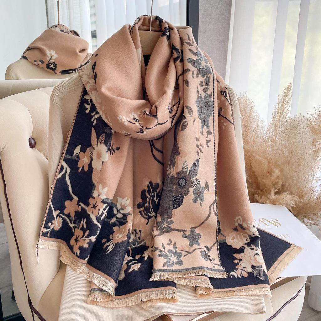 Szalik Damski Imitacja Kaszmiru, Szal Dwustronny w Kwiaty w Stylu Retro Chińskim, Gruby i Ciepły