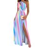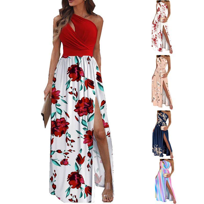 Printed Slant Neck Sleeveless Dress Print Diagonal Collar Sleeveless Split Dress Female