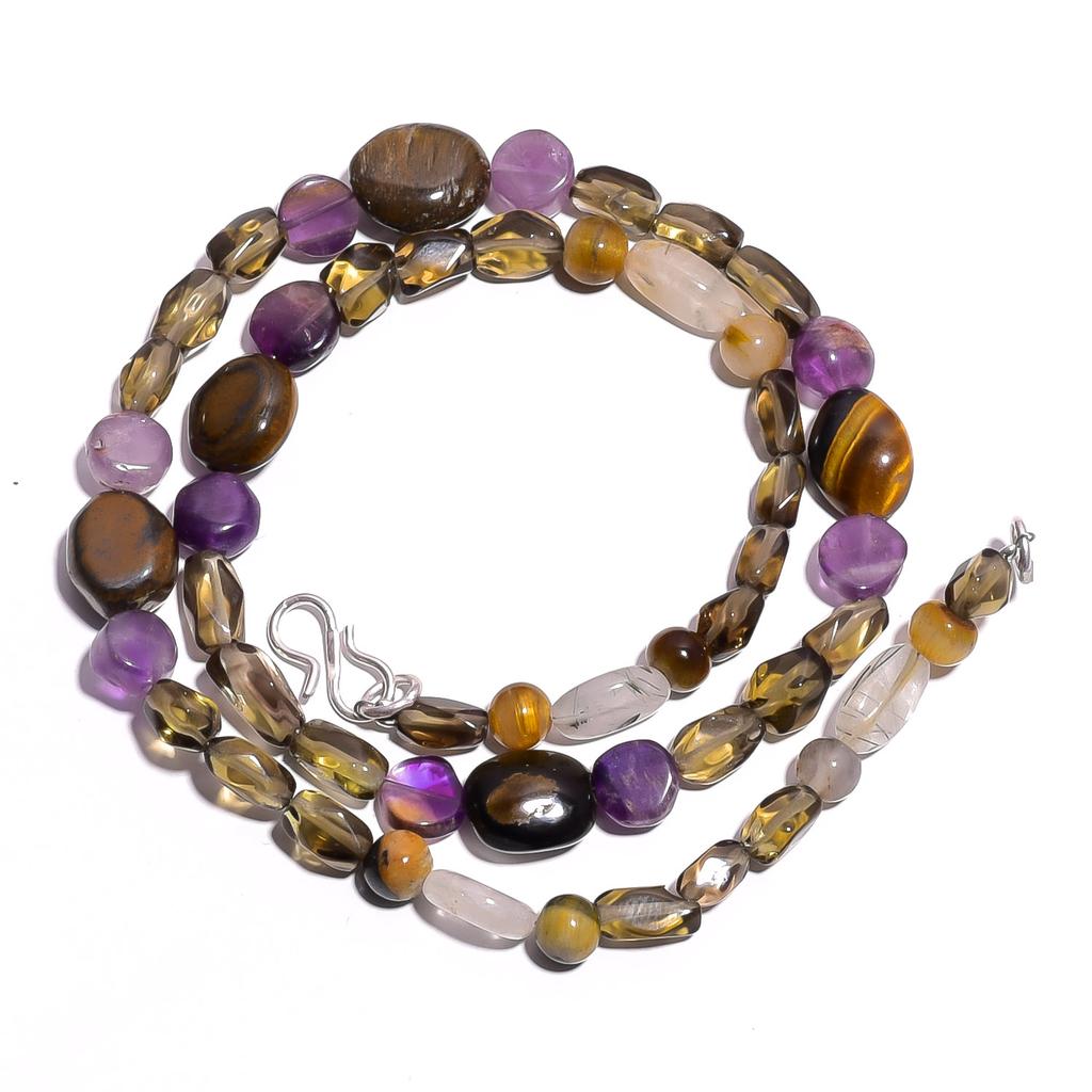 Natural Smoky Quartz Amethyst Tiger Eye Gemstone Beads Necklace 17" UB-4231 UB-4231