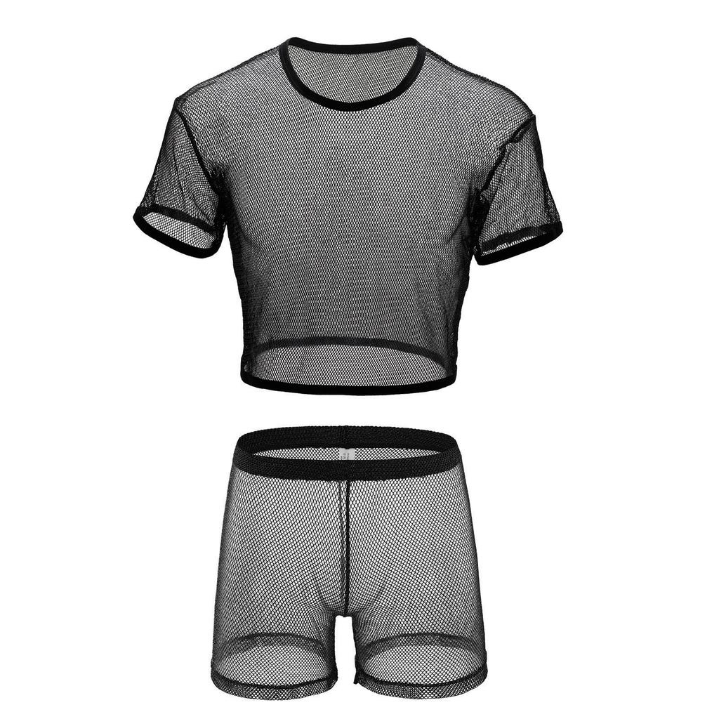Men Sexy Crop Tops Transparent Fishnet Boxers Set Mesh Lingerie Man T-Shirt Hollow Out Net Clubwear Silvery Shine