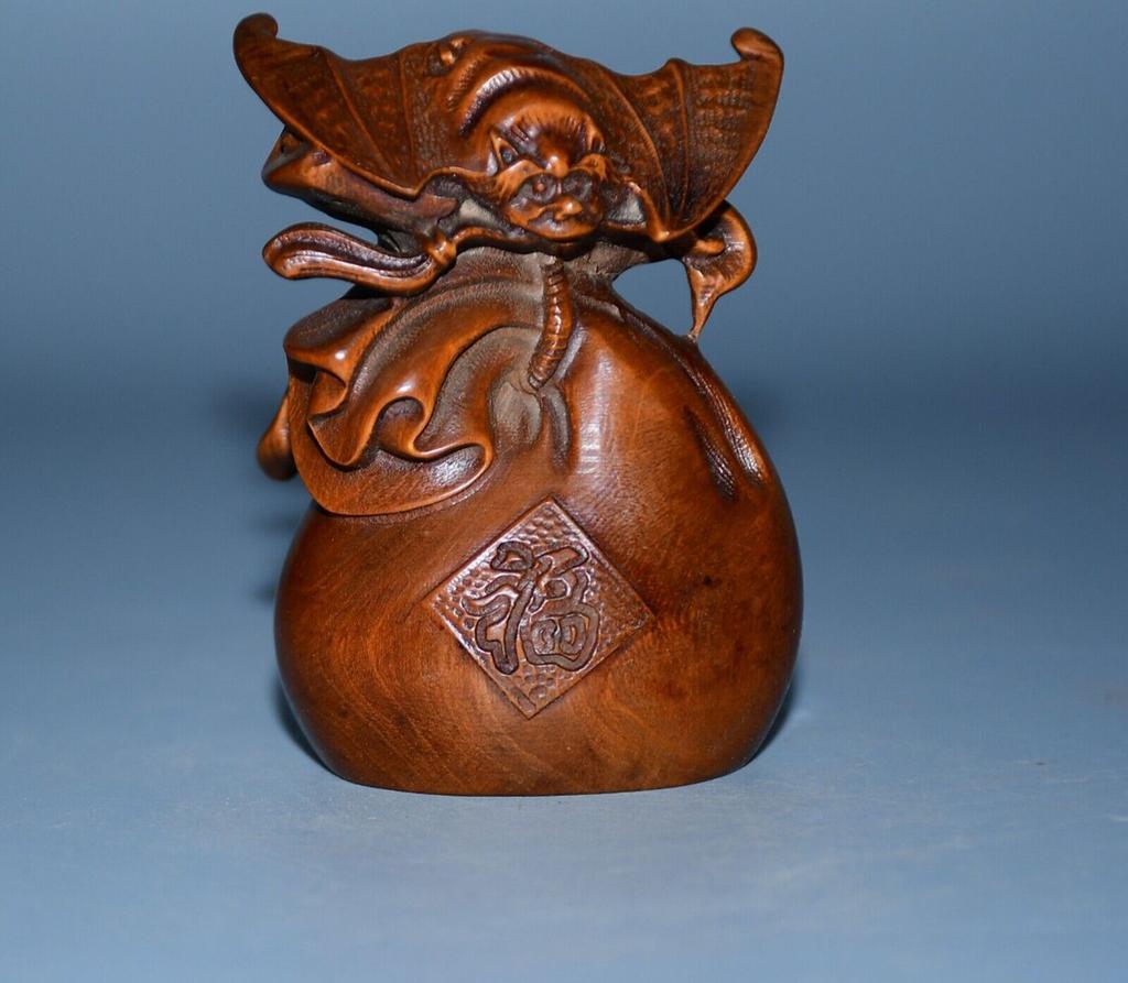 Chinese Old Boxwood Carved Exquisite Bat Money Bag Statue Figurines Lucky Gift