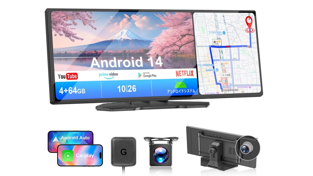NZACE Przenośny Wyświetlacz Audio, pierwszy w branży z systemem Android 14, 8-rdzeniowy procesor, 4 GB RAM + 64 GB ROM pojemności, ekran 10,26 cala, obsługuje YouTube i Netflix, funkcja kamery samochodowej, jednoczesne nagrywanie z kamery przedniej i tylnej, CarPlay, bezprzewodowe dublowanie Android Auto, wyświetlacz IPS 1920*720 pikseli, podwójny podzielony ekran, Reverse Link, kompatybilny z pojazdami 24V
