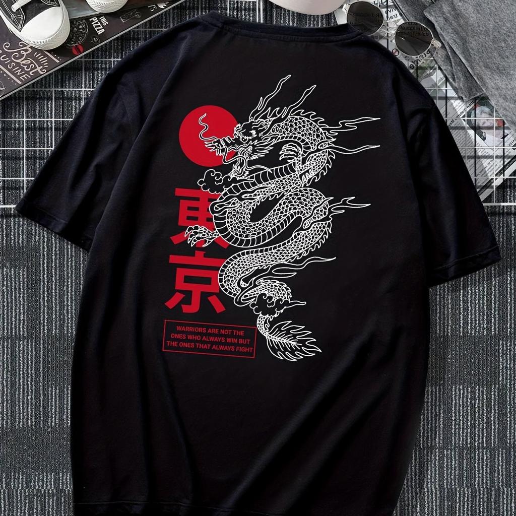 Oddychający T-shirt z okrągłym dekoltem i nadrukiem smoka dla mężczyzn Łatwy w pielęgnacji, rozciągliwy poliester, casualowa koszulka na co dzień
