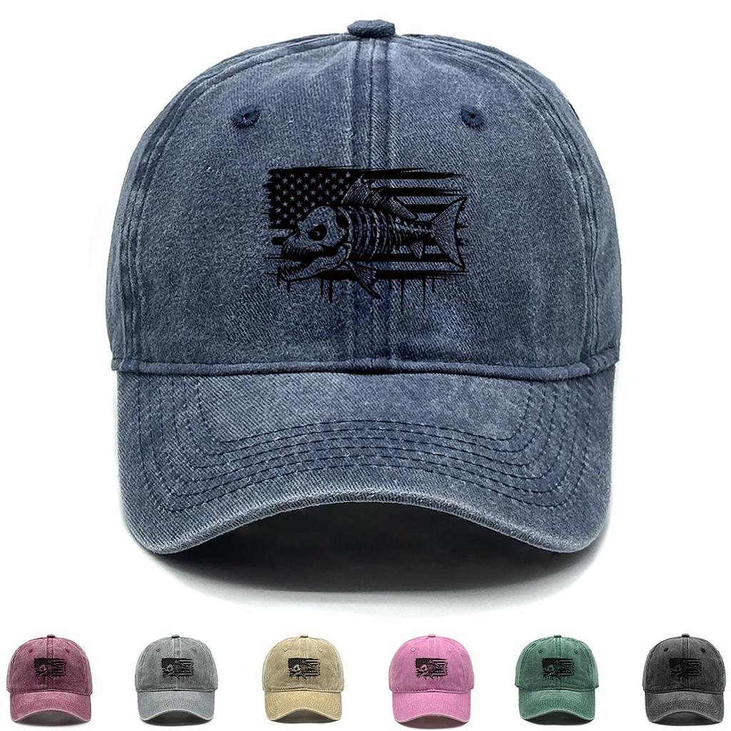 American Flag Fish Skeleton Print Adjustable Baseball Hat, Patriotic Mesh Hat Retro Distressed Non-Stretch Fabric Washed Snapback Sun Hat