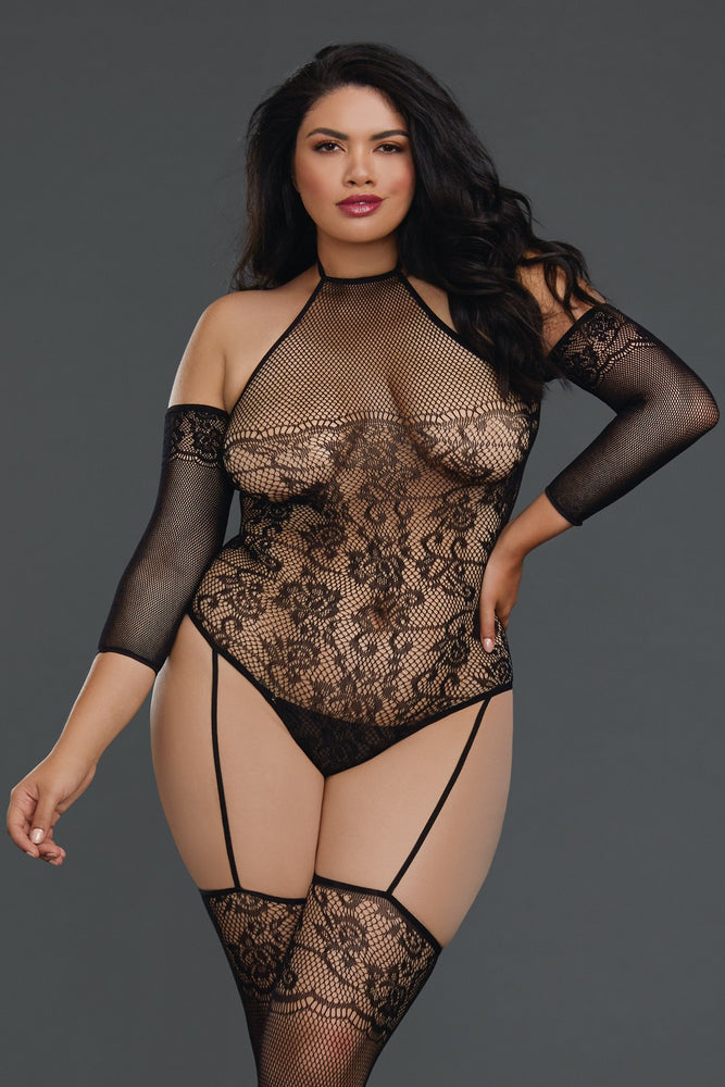 Bodystocking Grande Taille Résille Effet Bas Jarretelles Dg0310 Xblk