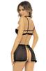 Ensemble de lingerie moderne, avant-gardistes dans un style "dominatrice sexy", composé d'un soutien-gorge, porte-jarretelles jupe et de son string assorti; Soutien-gorge avec bonnet en mousse et fine résille transparente. Bretelles ajustables et fermeture à crochets au dos. jupe porte-jarretelles avec bandes opaques et fine résille transparente et string assorti Bas non inclus. Réf. 0277 vendu séparément.Composition : Soutin-gorge : Microfibre : 95% Polyester, 5% Élasthanne ; Maille : 80 % nylon, 20 % élasthanne ; Bonnet en mousse : 100 % polyester ; Jupe porte-jarretelles : microfibre : 95 % polyester, 5 % élasthanne ; Résille : 80 % nylon, 20 % élasthanne ; String : Microfibre : 95 % polyester, 5 % élasthanne .Conseil d'entretien : Laver à la main séparément à l'eau froide, pas de sèche linge.