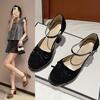 Fashion Hot Selling 2025 Summer New Style Satin Bow Knot Square Head Mary Jane Heel Shoe Horse Hoof Heel One Strap Buckle Single Shoe