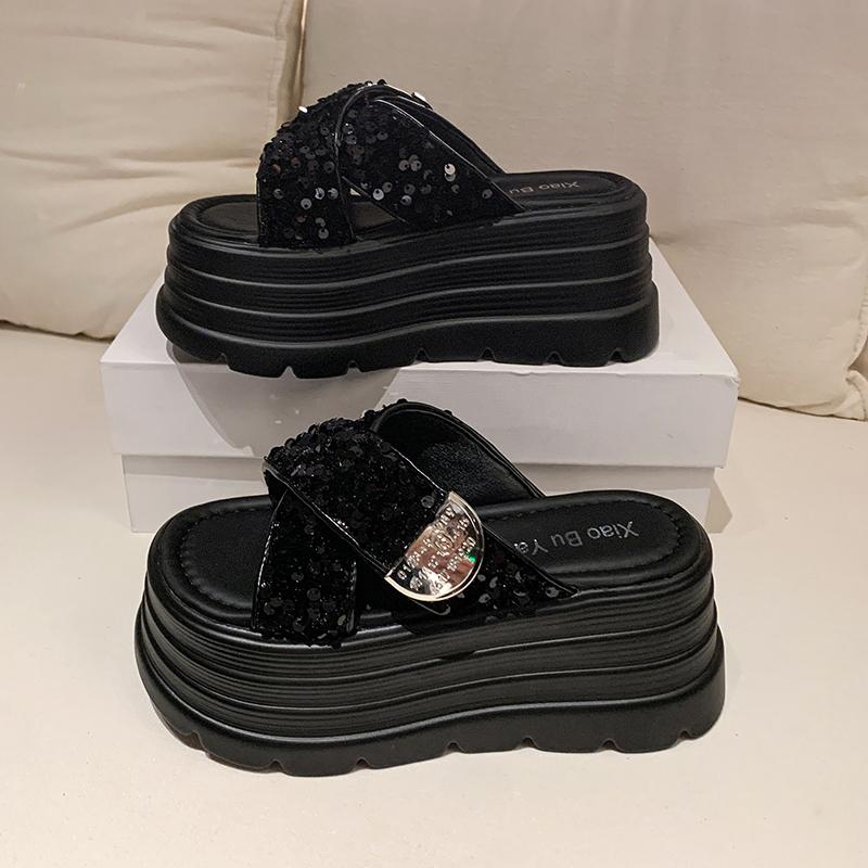 Modne Damskie Klapki na Wysokiej Platformie 8CM Letnie Błyszczące Modne 2025 Nowe Sandały na Podwyższeniu Codzienne Klapki Muffin Obcasy Buty Plażowe