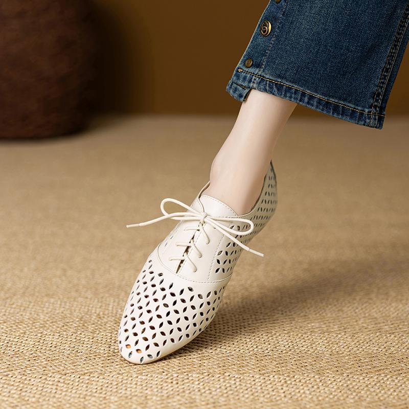 Fashion 2025 Summer New Women Flat Shoes Round Toe Hollow Out Basic Casual Working Comfortable Soft Genuine Leather Shoes Woman Concise