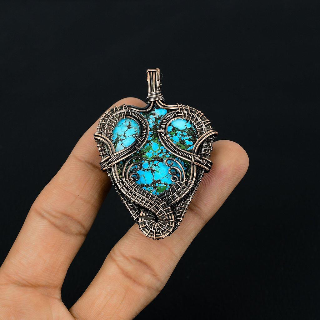 Wisiorek z turkusu tybetańskiego, biżuteria z kamieni szlachetnych owinięta drutem miedzianym próby 999, ręcznie robiony wisiorek, na Święto Dziękczynienia