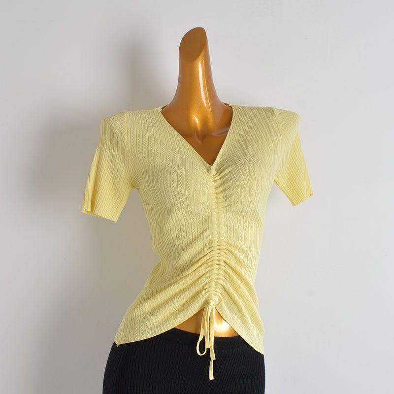 French Style New Arrival Solid Color and V-neck Drawstring Lace Ice Silk Sweater Women's Clothing Summer Silm Fashion Short Sleeve T-shirt