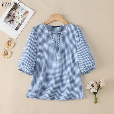 Damska casualowa bluzka w kratę z okrągłym dekoltem i rękawem 3/4