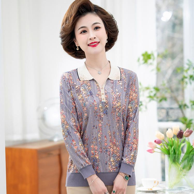 Bluzki damskie Babcine klapy i kwiaty dla osób w średnim i starszym wieku Ubrania dla kobiet Wiosna i jesień Koszulka bazowa matki Nowy styl