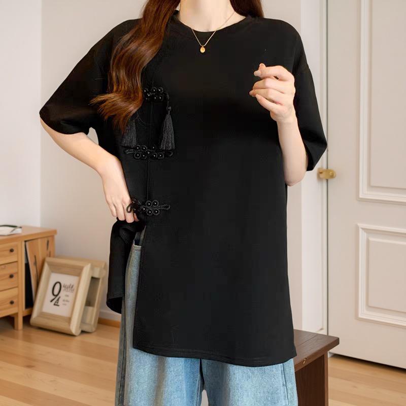 Introducing a stylish and comfortable plus-size T-shirt inspired by the retro Chinese Republic style, perfect for summer. This long T-shirt is crafted from high-quality cotton, ensuring a soft and breathable feel. It features a charming bowknot decoration that adds a touch of elegance to the design. The round neckline and short sleeves provide a classic and versatile look, making it an ideal choice for casual outings or relaxed days at home. Embrace a blend of tradition and modernity with this unique and fashionable piece.