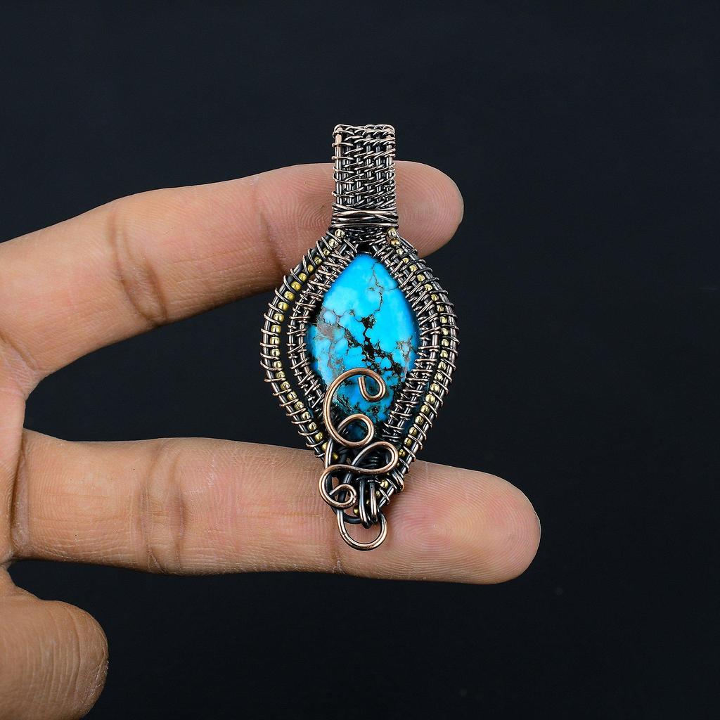 Wisiorek z turkusu tybetańskiego, biżuteria z kamieni szlachetnych owinięta drutem miedzianym próby 999, ręcznie robiony wisiorek, na Święto Dziękczynienia