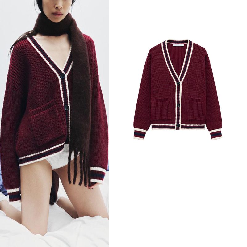 Fall and Winter New Women's Clothing Preppy Style Contrast Ribbon Trim V-neck Long Sleeves Knitting Cardigan Outwear 6771154