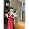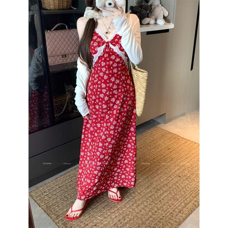 Kumikumi Design Sense Lace Stitching Sling Dress Women Summer Holiday Style High Waist All-Match Floral Long dress