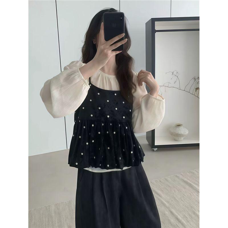 Kumikumi Sweet Set French Style Polka Dot Brace Vest Women's Autumn Loose round Neck Long Sleeves Shirt Two-piece Set