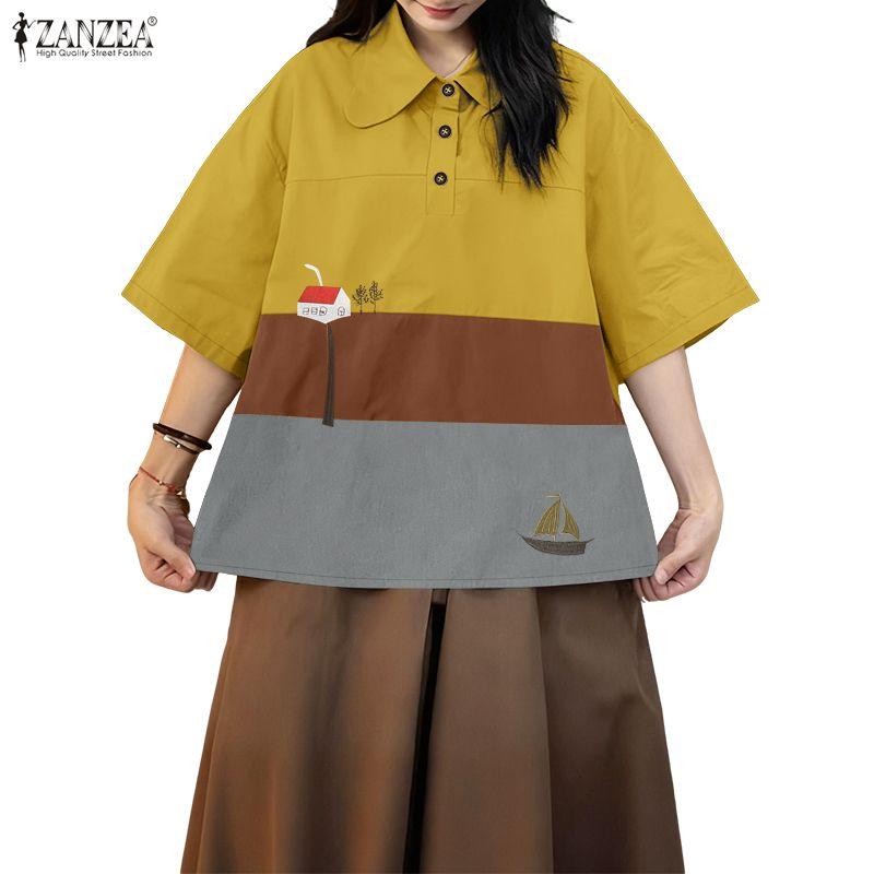 ZANZEA Damska casualowa luźna bluzka z krótkim rękawem, z kołnierzykiem i nadrukiem