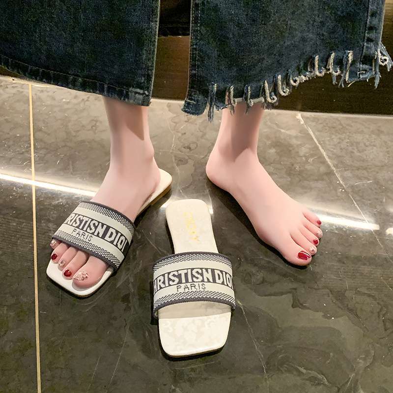 Pantofle haftowane literami damskie do noszenia na zewnątrz 2025 lato nowa moda płaska podeszwa do noszenia na zewnątrz plażowe jednosłowne sandały ins tide