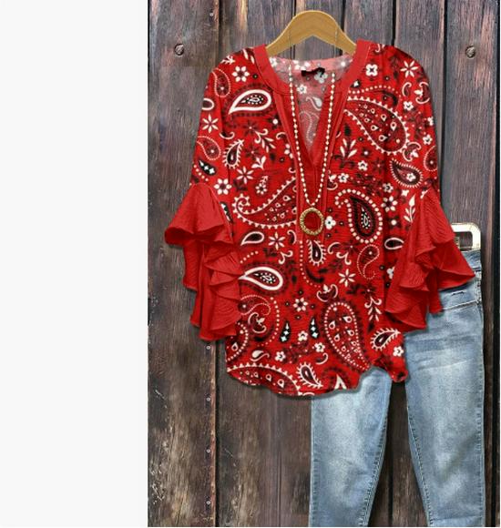 This trendy women's casual T-shirt features a stylish V-neckline and a charming floral print, perfect for adding a touch of elegance to any outfit. Designed with a unique lotus leaf edge, the T-shirt offers a distinctive and feminine flair. Crafted from high-quality polyester, it ensures a comfortable fit and durability. The half-sleeve length adds a versatile touch, making it suitable for various occasions and seasons. Ideal for those looking to combine comfort with contemporary fashion.