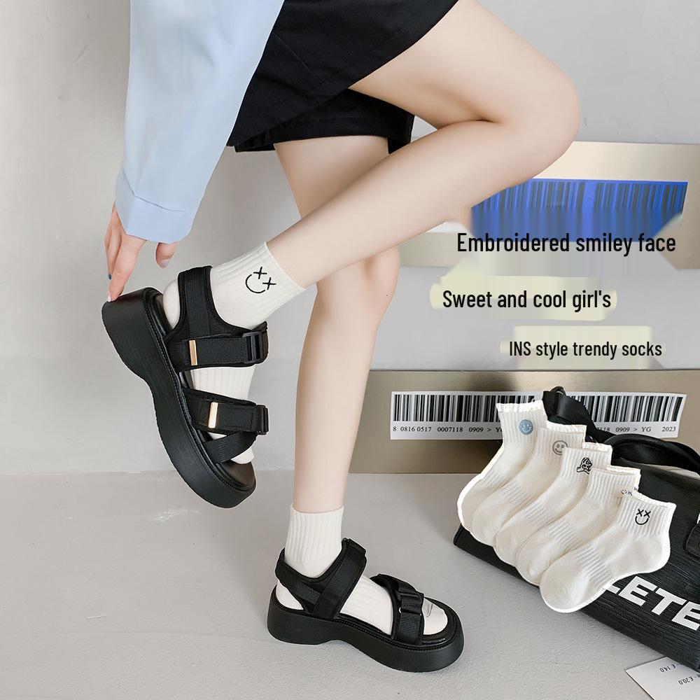 Women’s Spring/Summer Ankle Socks - Cute Smiley Face Embroidery, Japanese Style, Unisex Pure Cotton Sport Socks