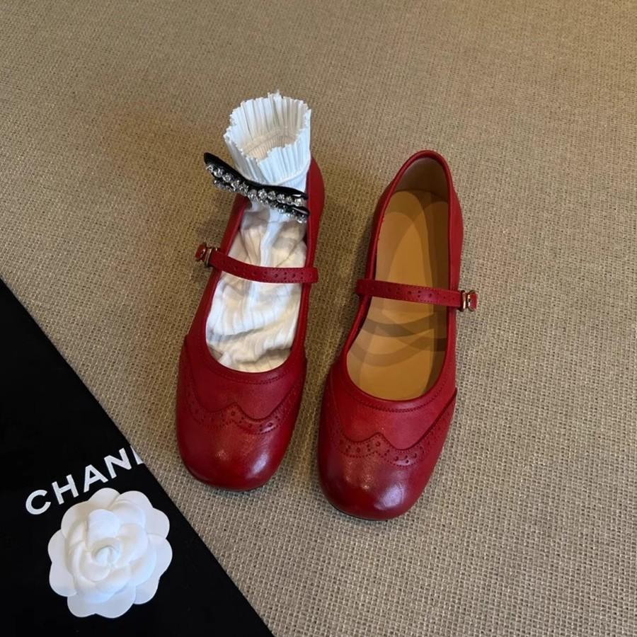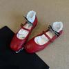 Wersja z owczej skóry~ retro okrągły nosek czerwone pojedyncze buty damskie płytkie wsuwane z paskiem z wygrawerowanymi małymi skórzanymi butami płaskie buty Mary Jane