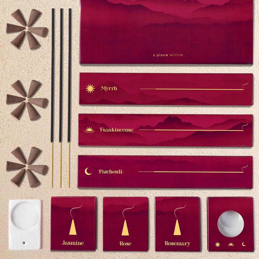 Zestaw kadzideł premium z mirrą, kadzidłem, paczulą, różą, jaśminem i rozmarynem do medytacji, jogi lub relaksu.